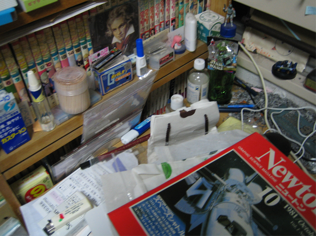 ↑と↓は、机の左側にある本棚の一部のアップ。