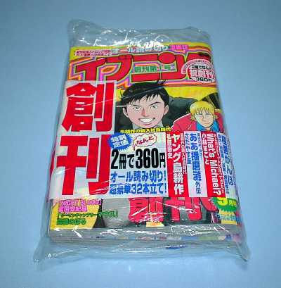 噂の新雑誌。モーニング新マグナム増刊をベースとして、いろいろモーニング本誌ヒット作エキスを注入しつつ新創刊。B5中とじ2分冊、さらにビニール袋でパックされており、かなり珍しい販売形態での創刊となった。いちおうビニール詰めの状態を記念撮影。2冊でもお値段は360円とデフレスパイラっている。といってもこの形式は創刊号だけで、次号からはちゃんと1冊で販売。毎月19日発売の月刊誌である。創刊号にはクリアファイルとかキーホルダーとかが付録として付けられていた模様。俺はクリアファイルをもらいました。