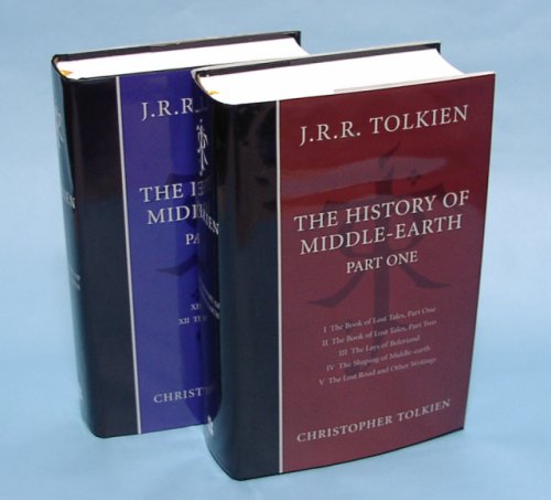 ▼キタ───────!! 何が来たかというと、昨年の10月2日の日記で触れてその後注文した、「THE HISTORY OF MIDDLE-EARTH」がAmazonからついに到着したのだ。前にも書いたとおり、この本は「指輪物語」の著者であるJ・R・R・トールキンの遺稿や未完成原稿を、その三男のクリストファー・トールキンが編纂したもので、元はペーパーバックで12冊組だったものをハードカバーで3冊にまとめたもの。PART TWOは未入荷とのことで、まずPART ONE/THREEが到着。同様のものは以前化粧箱入りの豪華なのが出ていたのだが、今回購入したのはその廉価版。といっても1冊1万円ちょい、合計で3万円以上するゴツい本だ。本の大きさは縦の長さが広辞苑と同じくらいで、厚さは3巻合計するとたぶん広辞苑の2倍くらいになりそう。まあ字詰めはゆったりしているんで広辞苑ほどの文量にはならないけど、なんにせよ分厚いことに変わりはない。