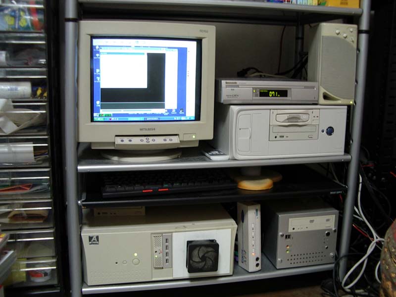 ▼これでマシンを組んだ結果、AVパソコン環境は写真のような状態に。写真でいうと右上にある、スピーカーとCATVセットトップボックスが乗っかっている、白い横置きデスクトップ型がVideoGate用。左下の大きめのデスクトップがキャプチャーマシン1で、切り替え機を挟んで右にあるキューブPCがキャプチャーマシン2。1箇所にマシンがゴチャッと詰め込まれてて、なかなか壮観。ちなみにキャプチャーマシン1の前面、5インチベイ部分には、プラ板が張ってあり、そこに8cmファンを付けて吸気を行うようお手軽改造してたりします。これで5インチベイの中段部分に外気を通すことで、上段と下段に取り付けてあるHDDケースを冷却する仕組み。このケース(AOpen HX95。HX95-P4の前バージョン)は5インチベイが3個ある貴重なATXのデスクトップケースなんだけど、通気性が悪くて熱がこもりやすいので、こんなふうにしている。