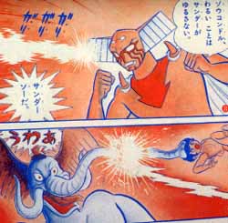 ↑ 頭部にコンドルをくっつけたゾウの怪人。第2話に登場。 頭のコンドルがしゃべったりするのは、「グレートマジンガー」の戦闘獣とかを思い出す。 サンダーの必殺技「サンダーソー」でやられるが、この技は「サンダーのひみつ」によれば、 「でんぱを のこぎりのようになみうたせ、てきを きる。」とあり、なんだかサッパリわからない。 最後に投げ飛ばされて爆発するが、いったいどういう怪人なんだろう?